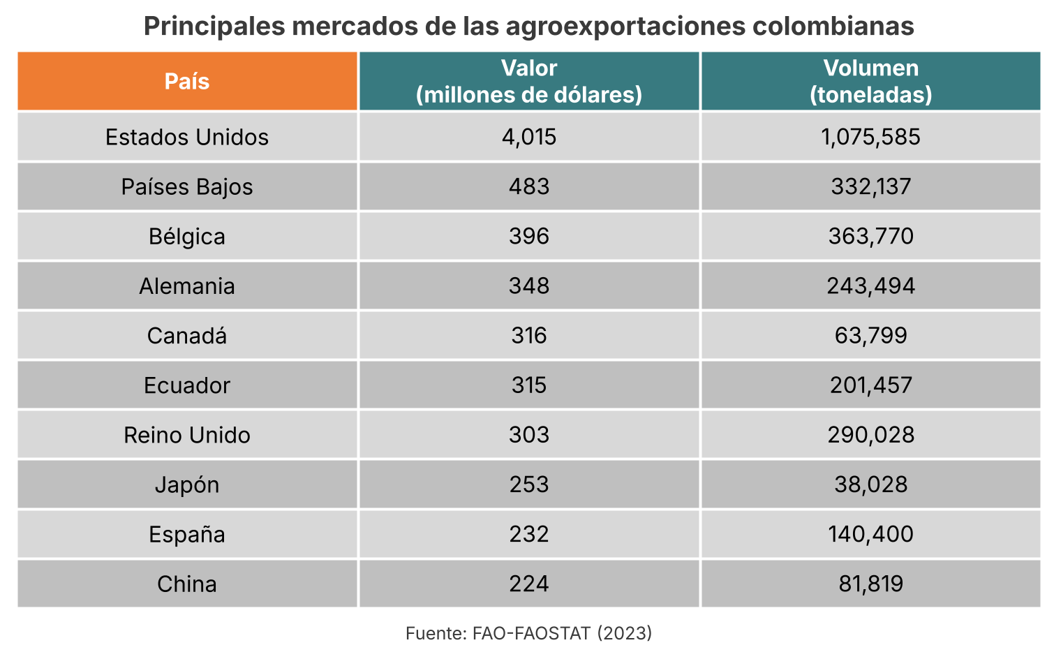 Otros destinos clave incluyen Canadá, Ecuador, Japón, China, Venezuela, México y Chile, lo que refleja una gran diversificación de las agroexportaciones colombianas.