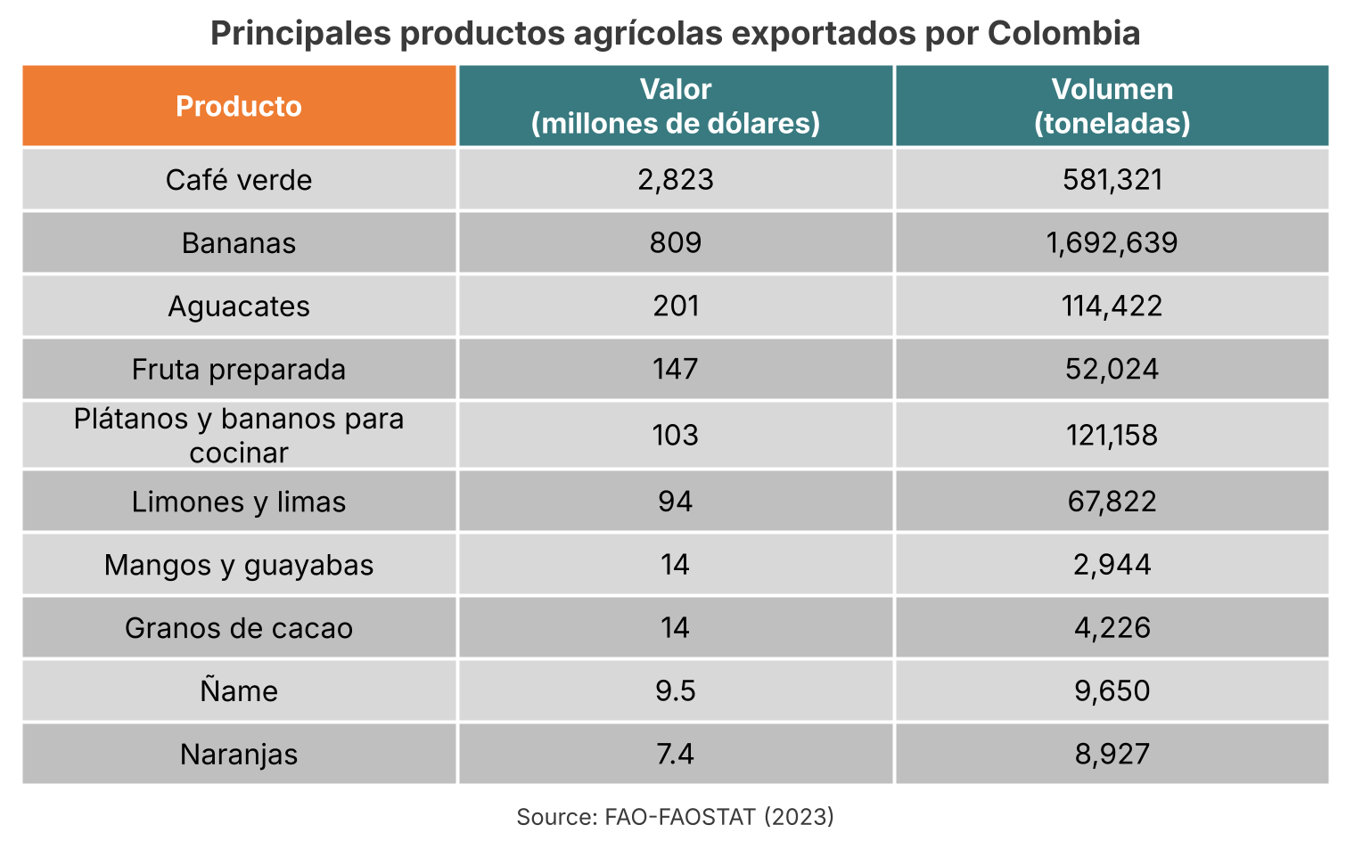 El café verde, los bananos y los aguacates son las principales exportaciones de Colombia, representando en conjunto alrededor del 40% del valor total de exportación. También destacan frutas como limones, limas, mangos y naranjas.